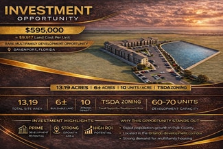 Property Overview Discover this high-potential development parcel located on Old Kissimmee Road in the rapidly growing city of Davenport, Florida. Situated just minutes from key amenities and major highways, this land offers a rare blend of flexibility, accessibility, and development readiness. Property Details Current zoning allows up to 10 dwelling units per acre Please see attached FAR calculation. - Total Area: Approx. 13.19 acres - Upland Area: Approx. 8.7 acres - No Wetland Impact The site currently allows up to 10 residential units by right. Approximately 8.5± acres are uplands and considered buildable. Based on allowable FAR of approximately 0.30 to 1.00, the property offers strong density upside with potential for 100+ residential units at 0.50 FAR or higher, subject to zoning, environmental, and county approvals.