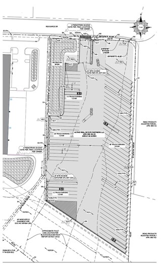 Resource Drive is comprised of one parcel in Reno’s North Valleys. The total land acreage is ±7.04 acers. The Subject Property is conveniently located off Moya Boulevard, only a five-minute drive from the nearest Highway 395 on/off ramp. The site is entitled for a ±4.6 acers of industrial outdoor storage. Plans have been set to have two 24’ site access gates per DTL SHT CD4, 137 12’x55’ truck parking spots, and with 84’ clearance between parking spaces running down the middle. Land Size ±7.04 AC (±4.6 AC of IOS) Asking Rate Contact Broker Lease Rate Negotiable Parking 137 Truck Parking (12’X55’) Gates 24’ Site Access Gate Per Dtl Sht Cd4 APNs 090-142-15 Zoning I - Industrial