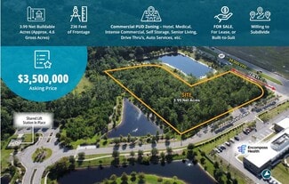 Asking Price: $3,500,000 Property Size: 3.99 net acres (approx. 4.6 gross acres) Zoning: Commercial PUD (Planned Unit Development) Development Potential: Suitable for hotel, medical, self-storage, senior living, drive-thru, auto services, and other intense commercial uses Availability: For sale, for lease, or build-to-suit options available Subdivision: Willing to subdivide