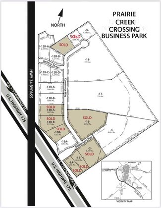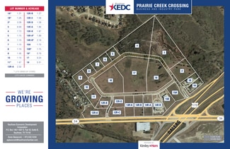 Prairie Creek Business and Industry Park is a planned development. Uses include light manufacturing, distribution, office and other commercial, allowing retail, restaurant and service uses. Lots include concrete streets, city water, city sewer, storm sewer, 3-phase electrical to your property and natural gas if needed. Tracts and pad sights that range from 1 acre to 20 acres are available. Prime location for your business. High traffic area on the new Highway 34 bypass and Highway 175. Call for more information today!
