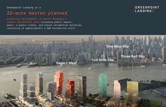 A 22-acre master planned development, Greenpoint Landing is North Brooklyn's newest waterfront mixed use development with public spaces, parks, a pre-k through 8th grade public school and eleven towers consisting of 5,500 residential units.