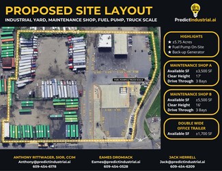 Improvements include two maintenance shops totaling ±9,000 SF with 16’–17’ clear heights and 12 drive-ins (6 drive-through bays), ±14,000 SF shop/office space, ±1,700 SF double wide office trailer, truck scale, fuel pump, and back-up generator. The paved, level, and demisable yard is well-suited for fleet storage, truck parking, container storage, heavy equipment operations, and logistics users requiring integrated maintenance capabilities.