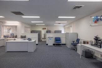 Windows surround the building providing ample sunlight into the offices. The lower floor features a vestibule leading onto an open plan office area, private offices, and restrooms.