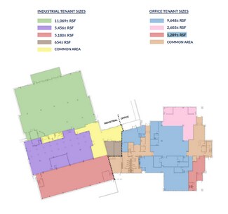 The industrial building has space ranging from 654± RSF to 22,359± RSF. Clear height ranges from 12’ to 28’ with column spacing of 22’x40’ in the warehouse and 22’x24 in the production area. There is 2500 amps, 480/277 v of power and three loading docks (2 w/levelers).