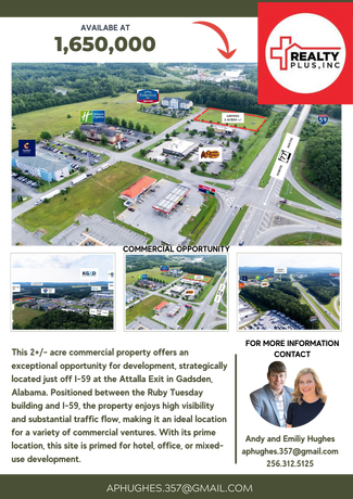 Prime commercial income opportunity in the rapidly growing Gadsden–Attalla corridor. This 2± acre property is ideally located just off Interstate 59 at the Attalla exit, offering outstanding visibility and easy access for travelers and local traffic.