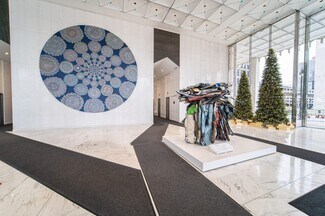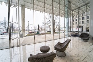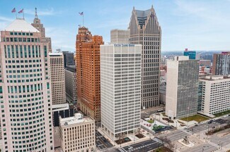 The first skyscraper designed by architect Minoru Yamasaki (who went on to design the World Trade Center), the landmark at One Woodward Ave. was constructed in 1962 as the Michigan Consolidated Building for the gas company. It was bought and rebeautified by Bedrock in 2012, welcoming the Fifth Third bank in 2014. Since known as Fifth Third at One Woodward, the 28-story structure of welded steel and precast concrete features a façade of white marble, an entrance piece in bronze created by sculptor Giacomo Manzu (who had created pieces for the Vatican) and rooftop latticework with colored lighting. Every level is surrounded by a series of narrow windows, many looking out onto Hart Plaza and the Detroit River. The property includes event and meeting space in the glass-enclosed lobby and the wraparound patio, along with an underground parking garage.