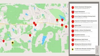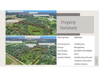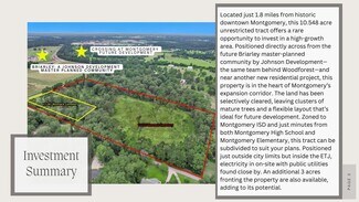 Located just 1.8 miles from historic downtown Montgomery, this 10.548 acre unrestricted tract offers a rare opportunity to invest in a high-growth area. Positioned directly across from the future Briarly master-planned community by Johnson Development—the same team behind Woodforest—and near another new residential project, this property is in the heart of Montgomery’s expansion corridor. The land has been selectively cleared, leaving clusters of mature trees and a flexible layout that’s ideal for future development. Zoned to Montgomery ISD and just minutes from both Montgomery High School and Montgomery Elementary, this tract can be subdivided to suit your plans. Positioned just outside city limits but inside the ETJ, electricity in on-site with public utilities found close by. An additional 3 acres fronting the property are also available, adding to its potential.