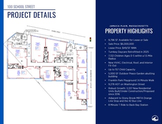 Turnkey Daycare Finished in 2025 Available for Lease or Sale. • 9,796 SF Available for Lease or Sale • Turnkey Daycare Retrofitted in 2025 •Sale Price: $6,000,000 •Lease Price: $49/SF NNN • 7,132 Children Ages 0-5 within a 1.5 Mile Radius • New HVAC, Electrical, Roof, and Interior Fit-Out • Up to 157 Child Capacity • 5,000 SF Outdoor Peace Garden abutting building • Franklin Park Playground | 6 Minute Walk • 9,278 ADT on Washington Street • Robust Growth: 3,337 New Residential Units Built/Under Construction/Proposed since 2016 • Adjacent to Stony Brook MBTA Orange Line Stop and the 42 Bus Line • 8 Minute T Ride to Back Bay Station