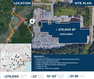 Situated on industrial zoned ±21.36 acres, the facility provides ample parking with 127 car parking spaces and extensive trailer loading and parking. Additional parking can be made from the adjacent greenspace. Direct access to the Reading & Northern Railroad rail lines is available at the property. Businesses will enjoy easy access to Central Scranton Expressway, located about a mile from the property, and Interstate 81, about two miles away. Wilkes-Barre/Scranton International Airport is 20 minutes from the Keyser Valley Industrial Center. Within a day’s drive, truckers can reach roughly 60% of the nation’s population and 40% of Canadian consumers.