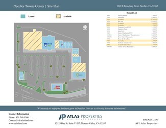 Busy Shopping Center located at a major signalized intersection with easy access from all directions. High visibility from the freeway and the street. Anchored tenants: Rite-Aid, Caltrans, DMV, San Bernardino County Services Center, & Domino's Pizza. Surrounded by residential community and new housing under construction. Area is growing and improving. Temporary space and free standing pad also available. NEC of Interstate 40 & US Hwy 95 Located adjacent to I-40 and U.S. Hwy 95 with Broadway Ave. off ramps in front of the Shopping Center.