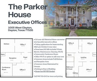 Welcome to the Parker House! This piece of history was built in 1914. Over the past 100 years, this home has sheltered generations of three Dayton families, and now we hope it will shelter Dayton businesses for another 100 years to come. Featuring a recently remodeled interior, this building hosts 5 individual executive offices with a community conference room. Tenants will also have access to a full kitchen, reception area, foyer and garden space. Ample parking is provided in the rear of the building on the spacious half-acre lot with a covered drop-off and pick-up area. The property is monitored by 24/7 security services, with cameras on all 4 sides of the building and sensors on every downstairs door and window. House wi-fi is available, though individual accounts are available directly through Xfinity for those with higher security requirements through HIPPA.