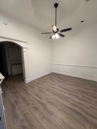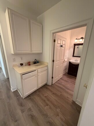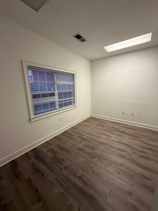 The suite features an inviting foyer/reception area highlighted by 12-foot ceilings and abundant natural light. The thoughtfully designed layout includes five spacious offices, numerous windows, an in-suite restroom, and a coffee bar complete with cabinetry and a sink.