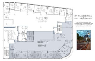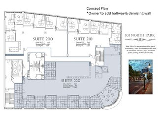 Office suite available to purchase or lease in premier 101 Park Building on Front St. in downtown Traverse City. Flexible space options from 2,160 SF to 6,024 SF. All 12 office/conference rooms on the north side of the space have floor to ceiling windows with spectacular Grand Traverse Bay and Boardman River views plus spacious open work area. Quality Class A building with high speed fiber capability and ADA accessibility/elevator. In the heart of all that downtown has to offer including restaurants, shopping, Boardman River, bike trail, marina and beaches. Office furniture available at no additional charge. Kitchenette plus additional copy and storage/breakroom areas. Plumbing available to add water for medical use. Less than 400 feet to Hardy Parking Garage. Conversion to residential is possible.