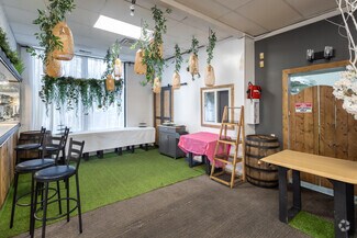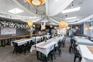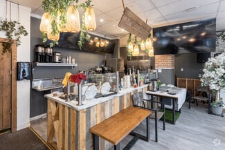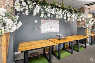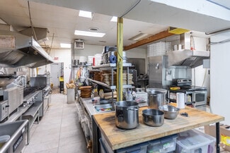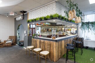 • Features include a commercial kitchen, a bar, a walk-in cooler & freezer, 80-seat capacity, and abundant natural light through expansive windows.