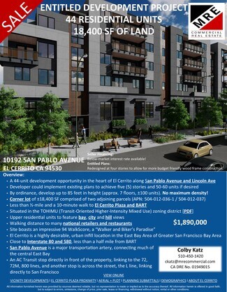 - A 44-unit development opportunity in the heart of El Cerrito along San Pablo Avenue and Lincoln Ave