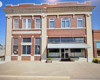 This distinguished two-story property, constructed in 1911, was originally home to the First National Bank of Meade, KS. Located at the intersection of HWY 23 and HWY 54, this property lies in the heart of the city of Meade. The first floor comprises three retail spaces totaling approximately 7,000 square feet. One unit, measuring around 1,850 square feet with solid wood flooring and a bathroom, is currently leased. A second space—previously occupied by an office supply store offering printing and cellular services—remains vacant and features a sizable rear warehouse with alley access for pickups and deliveries. The original bank vault remains installed in this area, which adds notable historical interest. The third retail space is presently leased to an insurance company.