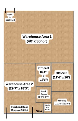 Smaller Warehouse Area - Located in front of the bay door, this section measures 29’7” x 18’3”, offering additional storage or workspace.