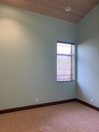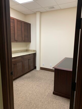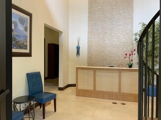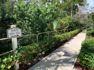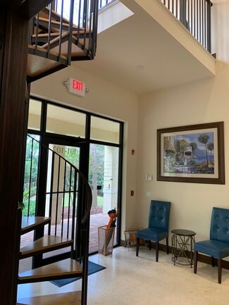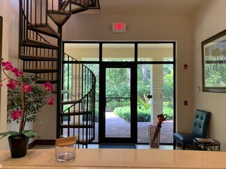 Three executive offices available within office suite; one with window and vaulted ceiling; another offers floor to ceiling custom cabinets with granite countertops. Reception area has vaulted ceilings with a custom bamboo desk and access to second floor viewing deck overlooking a Natural Preserve. Security system with alarm on all exits. Internet, electricity, water, use of kitchen and professional cleaning are included. Onsite property manager/owner. Building is equipped with hurricane doors and windows and is located in the quiet corner of Creekside with green space. Optimal location for Attorneys, Accountants, Insurance Professionals, Title companies, Mortgage brokers and business executives requiring a professional atmosphere to work and conduct meetings. Not zoned for medical. Option to add your own window signage. Mailbox key available. Rent 1-3 offices, option to rent reception desk.