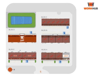 • Workhub Office/Warehouse: units w/ a front office, rear warehouse, roll-up door, restroom, LED lighting.
