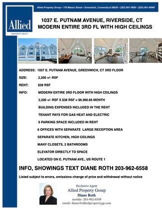 1037 E. PUTNAM AVENUE, RIVERSIDE, CT 3RD FLOOR MODERN ENTIRE 3RD FLOOR WITH HIGH CEILINGS 2,200 +/- RSF X $38 RSF = $6.966.66 MONTH BUILDING EXPENSES INCLUDED IN THE RENT TENANT PAYS FOR GAS HEAT AND ELECTRIC 6 PARKING SPACE INCLUDED IN RENT 6 OFFICES WITH SEPARATE LARGE RECEPTION AREA SEPARATE KITCHEN HIGH CEILINGS MANY CLOSETS 2 BATHROOMS ELEVATOR DIRECTLY TO SPACE LOCATED ON E. PUTNAM AVE., US ROUTE 1 INFO, SHOWINGS TEXT DIANE ROTH 203-962-6558 Listed subject to errors, omissions change of price and withdrawal without notice