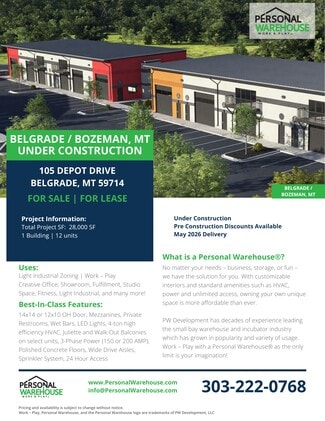 This newly developed Micro-Flex Personal Warehouse condominium project offers a rare opportunity to own high-quality, small-bay industrial flex space in one of the fastest-growing markets in the Gallatin Valley. Designed for entrepreneurs, owner-users, and investors and sport motor enthusiasts the project combines functionality, flexibility, and long-term value in a modern industrial setting.