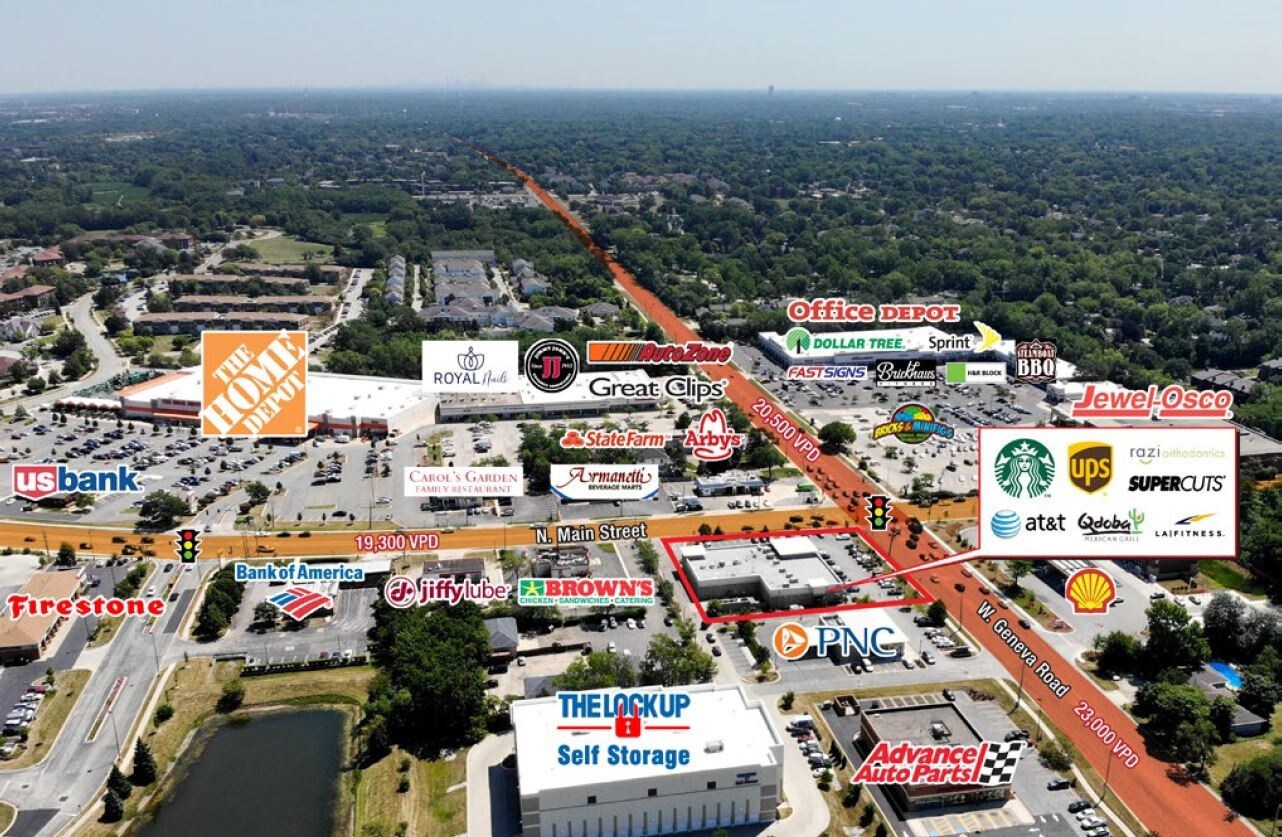 Excellent retail center located at the northwest corner of Main Street and Geneva Road. Center offers great visibility and frontage with strong traffic counts. Co-tenancy with Starbucks, Qdoba Mexican Grill, ATI Physical Therapy, Razi Orthodontics and the UPS Store. Area tenants include as Jewel Osco, Home Depot, Office Depot, Dollar Tree, PNC Bank, and many more.