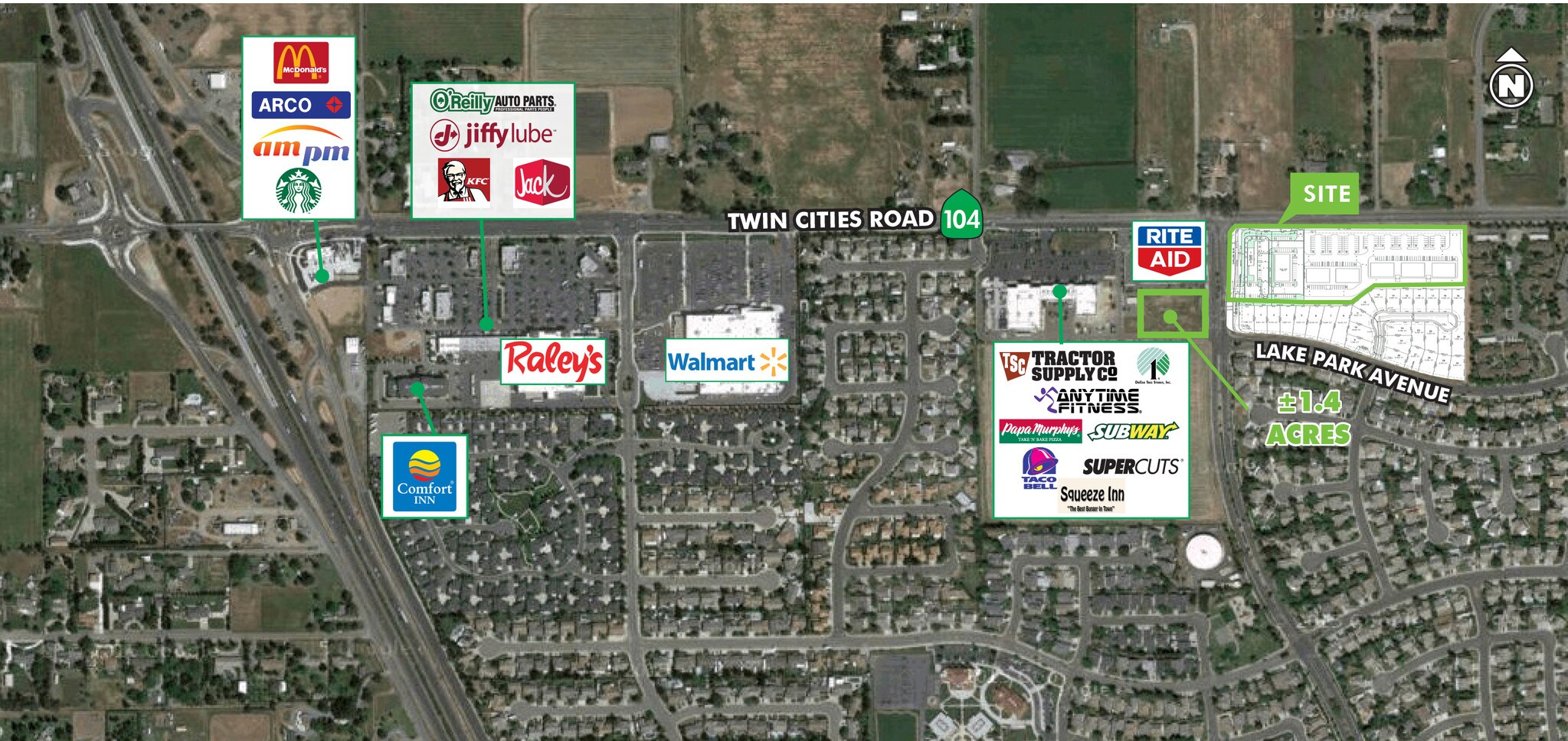 Carillion Corners Phase I is located on the southwest corner of Twin Cities Road/State Highway 104 and Carillion Boulevard—just east of the new Walmart in Galt, CA, approximately 20 miles south of Sacramento along Highway 99. Phase I has one remaining ±1.4 acre pad available and offers an excellent opportunity to serve the growing Galt market