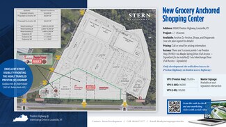 New retail power center by Stern Development located on rapidly growing Preston Highway corridor in Louisville, KY. Anchor space, outparcels and shop space are available on a +/-25 acre development site with more than 1,550 feet of road frontage. Preston Highway boasts over 50,000 VPD. The development site is served by two signalized intersections, and is the only site with direct access to Preston Highway, which is a limited access highway. The project sits near road grade with excellent street visibility, compared to most retail projects that are positioned far above road grade, with compromised visibility and access. Current tenants include: Chick-fil-a, Chipotle, Thornton's, 7-Brew, and Mike's Car Wash, and many more coming soon.