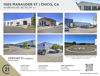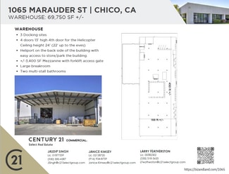 Office Size: +/-14,000 SF Amenities: Reception area, Private offices, Large cubicle areas, Conference rooms, Kitchenette, Large breakroom, Multi-stall bathrooms WAREHOUSE Size: +/- 69,750 SF 3 docking sites 4 doors, each 13feet high A 4th door specifically designed for helicopter access Ceiling height:24feet (22 feet up to the eaves) A heliport located on the back side of the building for convenient helicopter storage and parking +/-3,400 SF Mezzanine with forklift gate