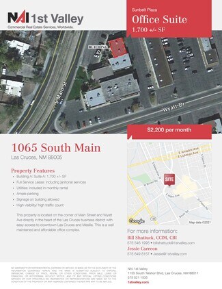 This property is located on the corner of Main Street and Wyatt Ave directly in the heart of the Las Cruces business district with easy access to downtown Las Cruces and Mesilla. This is a well maintained and affordable office complex.