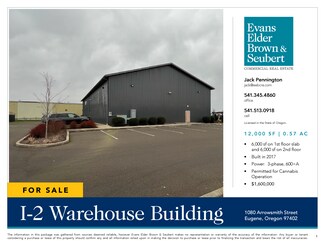 12,000 SF | 2-Story Building | 0.57 Acre Lot | Zoned I-2  • 6,000 sf on 1st floor slab and 6,000 sf on 2nd floor  • Built in 2017  • Power: 3-phase, Over 600 amps  • 1 roll-up door (12’ x 14’)  • Permitted for Cannabis Operation  • $1,600,000
