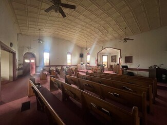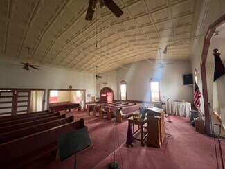 • The interior still contains the furnishings: pews, sound systems, microphones, lectern, and assorted furniture.