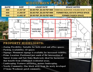 Versatile Retail or Office Suites in Established Fair Oaks Neighborhood Woodmont Plaza offers a rare opportunity to lease flexible ±1,157 to ±1,482 SF spaces ideal for office, retail, or specialty service use. Each suite has unique build-out potential and benefits from attractive, mature landscaping, excellent monument signage, and a growing residential base nearby. Take advantage of promotional first-year rent at just $0.90 PSF NNN and join a diverse professional community already calling Woodmont Plaza home.