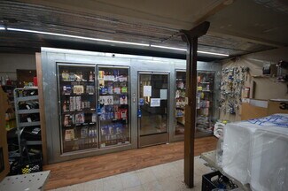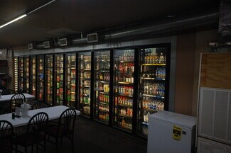Open market layout with ample shelving and cooler space and restaurant seating for up to 32