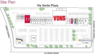 Von's anchored neighborhood shopping center located in affluent Via Verde community. Only grocery-anchored center serving the community. Conveniently located between the 57 Frwy and I-10. Easy ingress/egress with full block of Via Verde Ave. frontage. Join co-tenants Century 21, Montessori School. Looking for yogurt/ice cream, pizza, hair salon, insurance, tax, dance school, pilates/yoga/zumba. Call for information.