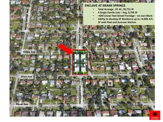 THE ENCLAVE at MIAMI SPRINGS. Incredibly rare opportunity to purchase 4 contiguous single family home lots in Miami Springs. Property is situated in the desirable Miami Springs Bird Section with frontage on both Wren and Oriole Avenues. Average lot size nearly 10,000 SqFt. RePlat, land use, zoning and addressing completed. First time since the 1950s/1960s an entire residential city block is available for purchase.