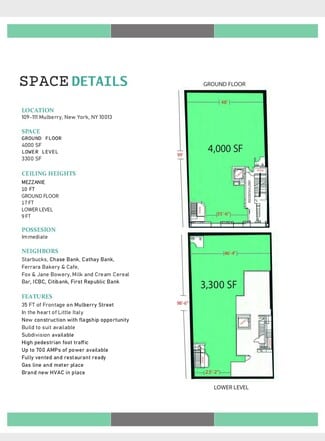 Located in the heart of Little Italy, this rare new construction TURNKEY RESTAURANT opportunity offers approximately 5,300 square feet of prime space on bustling Mulberry Street, with an impressive 35 feet of street frontage. This high-visibility location benefits from exceptionally high pedestrian foot traffic and sits among some of Manhattan’s most iconic dining and shopping destinations. The space features soaring 17-foot ceilings on the ground floor and a 10-foot ceiling mezzanine level, allowing for dramatic interior buildouts and flexible use. Built with modern infrastructure, the property is fully vented and restaurant-ready, complete with a gas line and meter already in place, brand new HVAC system, and up to 700 AMPs of power—ideal for food and beverage concepts or other power-intensive uses. Build-to-suit and subdivision options are available, making this an excellent flagship opportunity for retailers or restaurateurs seeking a dynamic, high-traffic Manhattan location. This is a truly exceptional chance to establish a presence in one of New York City’s most vibrant neighborhoods.