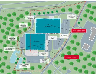 11200 Old Stage Road provides 208,000 SF with 12 docks and 3 drive-ins, ceiling heights ranging from 16 feet at the eaves to 29 feet at the spine, and 24x90 column spacing. 11300 Old Stage Road offers 167,000 SF with 21 docks and 2 drive-ins, including one oversized 14’ x 14’ door, and similar ceiling and column specs. Both buildings are rail-adjacent and offer trailer parking and double stacking capabilities.