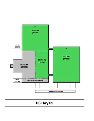 Industrial warehouse space, ideal for bulk storage, located on US Highway 69 just 2.5 miles from Interstate 35. 15,000 - 45,000 sf. available with access to 2 loading docks with 4 doors and 1 overhead doors. Warehouse clear ceiling height ranges from 20’-24’ with 800 amp electrical service. Some shared office space is available. Space is available now.