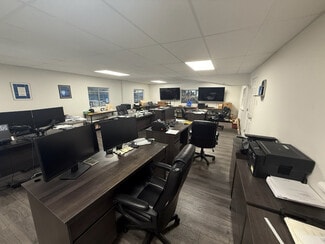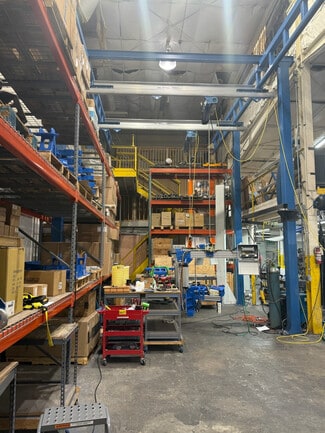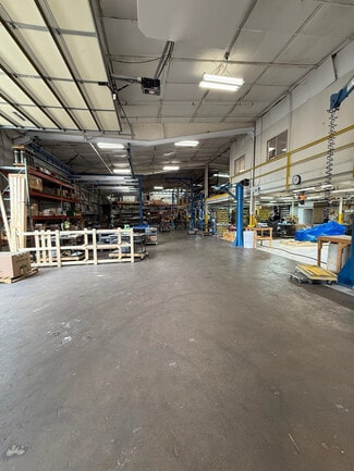 The building features two dock-high doors, one oversized drive-in door, and 18-foot clear heights, providing flexible loading and storage capabilities. A renovated mezzanine office space adds functional value for administrative operations, while shared covered outdoor storage enhances usability. The property is equipped with 3-phase power and offers optional retention of cranes and a compressor, making it move-in ready for specialized industrial users.