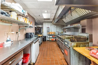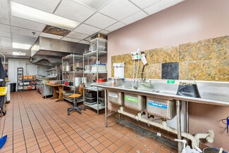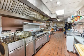 • Complete commercial kitchen with hood system, walk-in cooler/freezer, and dishwashing station