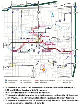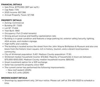 Excellent opportunity to own a commercial investment property in the wonderful community of Winterset. The property is fully leased with three retail tenants. It features strong annual revenue and a healthy capitalization rate. The building itself is in great condition and features a large parking lot, exterior safety/security lighting, ADA access, and modern signage. High traffic and visibility. The building is located across the street from the John Wayne Birthplace & Museum and also one block from the historic town square, rich in history, tourism, and a vibrant local business community. Winterset is widely known for its historic covered bridges, the birthplace of John Wayne, scenic byways, and holiday festivals. Winterset is the county seat of Madison County. Madison County tourism has earned a number of accolades and awards. City of Winterset population: 5,421. Madison County population: 17,161. Winterset median household income: $72,822. Majority of households in town are between $75,000-$100,000. Madison County median household income: $89,542. Please ask the listing agent for P&L statements All information obtained from seller and public records.