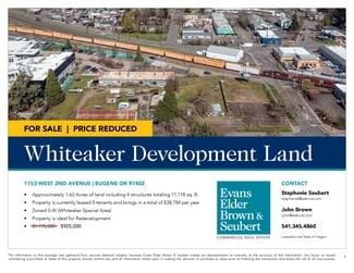 Whiteaker Development Land  • Approximately 1.63 Acres of land including 4 structures totaling 11,118 sq. ft.  • Property is currently leased 5 tenants and brings in a total of $38,784 per year  • Zoned S-W (Whiteaker Special Area)  • Property is ideal for Redevelopment  • Reduced Price: $925,000