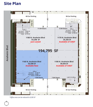 1160-1190 N Anaheim Boulevard is a 194,795-square-foot state-of-the-art distribution center with 26,700 square feet of pristine air-conditioned office space. Shared with Cort Furniture, this offering presents the opportunity to lease the remaining 55,598 square feet of industrial space in Suite 1160. This space is expandable to 140,497 square feet. Robust specifications at this facility include a 30-foot clear height and 3,000 amps, 277/480-volt, 3-phase power. The property sits on 8 acres of land zoned M2, providing ample space for the 30 exterior docks, three 10-foot by 10-foot drive-in bays, and 263 surface parking spots. All while being highly secure with its fenced lot and security system. Centrally located in Anaheim’s industrial corridor, 1160-1190 N Anaheim Boulevard has immediate access and impeccable visibility to the 91 Freeway, providing connectivity to the 594,642 people in a 5-mile radius. This center is conveniently located within 5 miles of a plethora of key tenants such as Old Dominion Freight Line and a FedEx Ground Distribution Center. Also, it is not far from key locations, such as 40 minutes from the Port of LA, 30 minutes from John Wayne Airport, 20 minutes from Long Beach Airport, 40 minutes from Los Angeles International Airport, and 45 minutes from Ontario International Airport. With only 82.50% of the area’s population being high school-educated, facility users can reach the 180,415 people in the local manufacturing workforce within a 10-mile radius. Cort currently occupies 43.6% of the building, totaling 84,899 square feet, and has been in place for over 17 years. This speaks volumes about the strength of the industrial market in Orange County, which is in the nation’s top 20 industrial markets, while also bolstering a vacancy rate of 1.4% below the national average vacancy for the industrial sector. Altogether, 1160-1190 N Anaheim Boulevard presents an exceptional opportunity for businesses seeking a secure, modern, and strategically positioned distribution facility in the heart of Orange County.