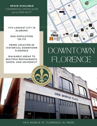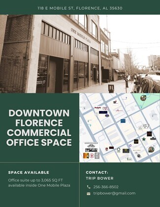 Commercial office building in the heart of historic downtown Florence, Al. It is located within walking distance to restaurants, the courthouse, and the University of North Alabama. With its own private parking lot, this office building is perfect for any size business ranging from a single space to an office business headquarters.