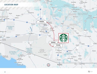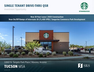 SRS Real Estate Partners-West, LLC is pleased to offer the opportunity to acquire the fee simple interest (land & building ownership) in an investment grade (S&P: BBB+), corporate guaranteed (NYSE: SBUX) Starbucks investment property located in Marana, Arizona (Tucson MSA). The tenant, Starbucks Corporation, recently signed a brand new 10 year lease with 4 (5-year) options to extend, demonstrating their commitment to the site. The lease features 10% rental increases every 5 years throughout the initial term and at the beginning of each option period, steadily growing NOI and hedging against inflation. The lease has minimal landlord responsibilities making it an ideal, limited-management investment opportunity for a passive investor.