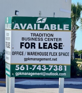 Welcome to Tradition Business Center Located on Village Parkway & Tom Mackie Blvd — Just minutes from the heart of Tradition and I-95! Tradition Business Center offers high-demand flex space surrounded by top retailers and restaurants. Perfect for small businesses, contractors, or logistics operations. Each unit features: Finished, air-conditioned office space Private half bathroom? Impact-resistant windows Attached warehouse with 10’ x 10’ rear roll-up door Don't miss out on this opportunity to grow your business in one of Tradition’s most sought-after locations. Contact us today for availability and a showing! Email: gpkmanagement@outlook.com