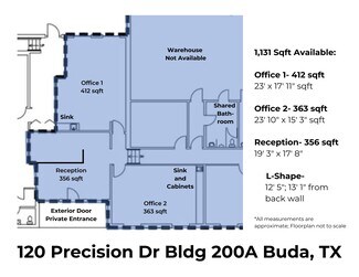 2 Offices with Private Entrance and Reception available (approx 1131 sqft)! This space is located within a warehouse and zoned for light industrial use. Just 1 mile south of downtown Buda, Texas, this space is ideal for businesses seeking a functional workspace in a rapidly growing commercial and industrial hub. Office 1: 412 sqft, with sink; Office 2: 363 sqft with sink and lower cabinets; Reception 365 sqft with a L-shaped partition perfect for a desk and customer-facing services.