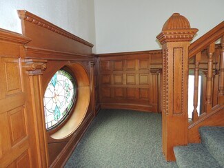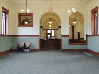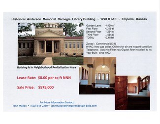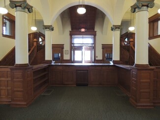 First library financed and built west of the Mississippi! Built from native limestone by Carnegie in 1901 with commemorative entrance plaque. Beautiful detailed architecture, wood and tile floor entry, stain glass and abundance of amazing wood work. Main floor with mirror floorplan; twin: side rooms, wooden staircases and coat closets. Two-story library stacks with decorative metal shelves and staircase and clear glass floor providing brightness and ambience. Rotunda with 360 degree view and thousands of signatures on wall by C of E graduates. Lots of office spaces on lower level. Handicap chair lift in the back of building.