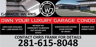 Luxury Garages for Cars, Boats, RV or Storage. Community Clubhouse with restroom. Units include: A/C & Heat, 8" concrete slab, sheetrock finish, LED lighting, Gated & Fully Fenced, 24/7/365 Secure Access, 12x14 Overhead door. There are 4 Sizes to choose from: 23'x55'-1,265 Sqft, 23'x60'-1,380 Sqft., 23'x65-1,495 Sqft. and 24'x70'-1,680Sqft. Prices from $175,000-$282,000. Units ready for showing. https://photos.rockbait.com/sites/12402-malcomson-rd-houston-tx-77070-16527840/branded